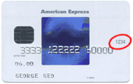 The American Express card verification number is located on the front of the credit card and is the four digits shown to the right of the card